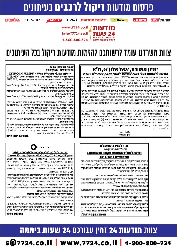 אנו במודעות 24 שעות בעלי ותק וניסיון רב בפרסום מודעות ריקול בעיתונים. צוות הגרפיקה שלנו ידאג לעצב לכם את המודעה בגודל המתאים ועל פי הדרישות. דרכנו ניתן לפרסם מודעת ריקול לרכבים בשני עיתונים יומיים בהתאם לדרישות ובמחיר הזול ביותר.