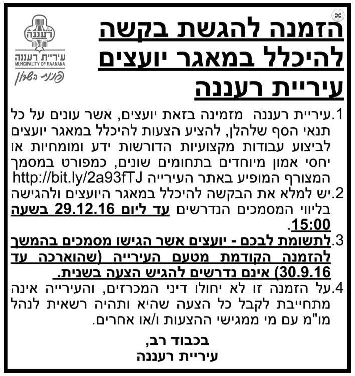 מודעות 24 שעות מפרסמת מודעות הזמנה להגשת בקשה להיכלל במאגר יועצים בעיריות וברשויות מקומיות. מודעות הזמנה להגשת בקשה להיכלל במאגר יועצים הינן מודעות המזמינות יועצים אשר עונים על כל תנאי הסף ויבצעו עבודות מקצועיות הדורשות ידע ומומחיות או יחסי אמון מיוחדים בתחומים שונים, על פי דרישות העירייה או הרשות המקומית.