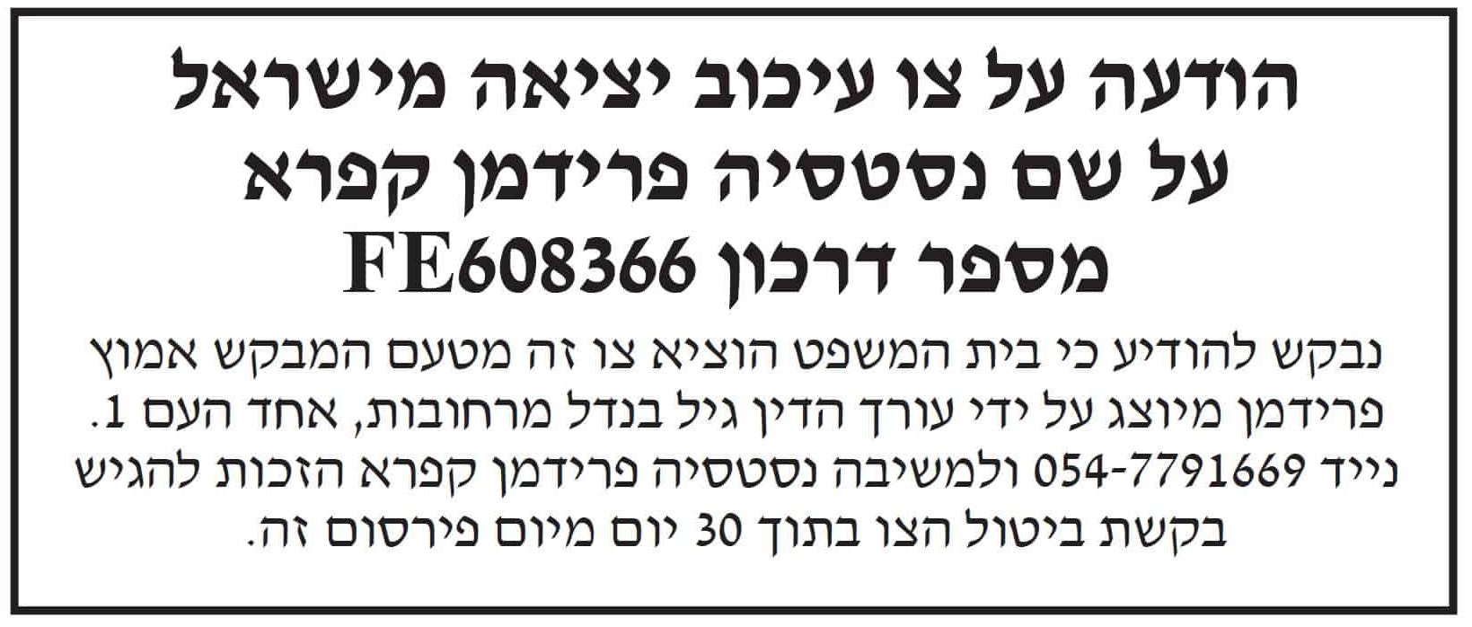 מודעות צו עיכוב יציאה מהארץ לדוגמה