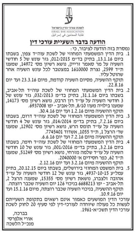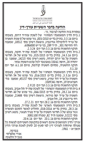 לעיתים הלשכות הגדולות במשק מפרסמות עדכון ושקיפות על השעיית רשיונות של עורכי דין, רואי חשבון, מתווכים וכדומה, מודעות 24 שעות מספקת מענה מהיר לפרסום מודעות השעייה! מודעת השעייה ניתן לפרסם בכל עיתון יומי, שבועי, עיתון מקומי ופרסום בעיתונים עם שפות זרות, אנחנו דואגים לכם מיד לאחר הפרסום לקבל סריקה של המודעה וגם לקבל את קובץ המודעה כפי שפורסמה בדואר.