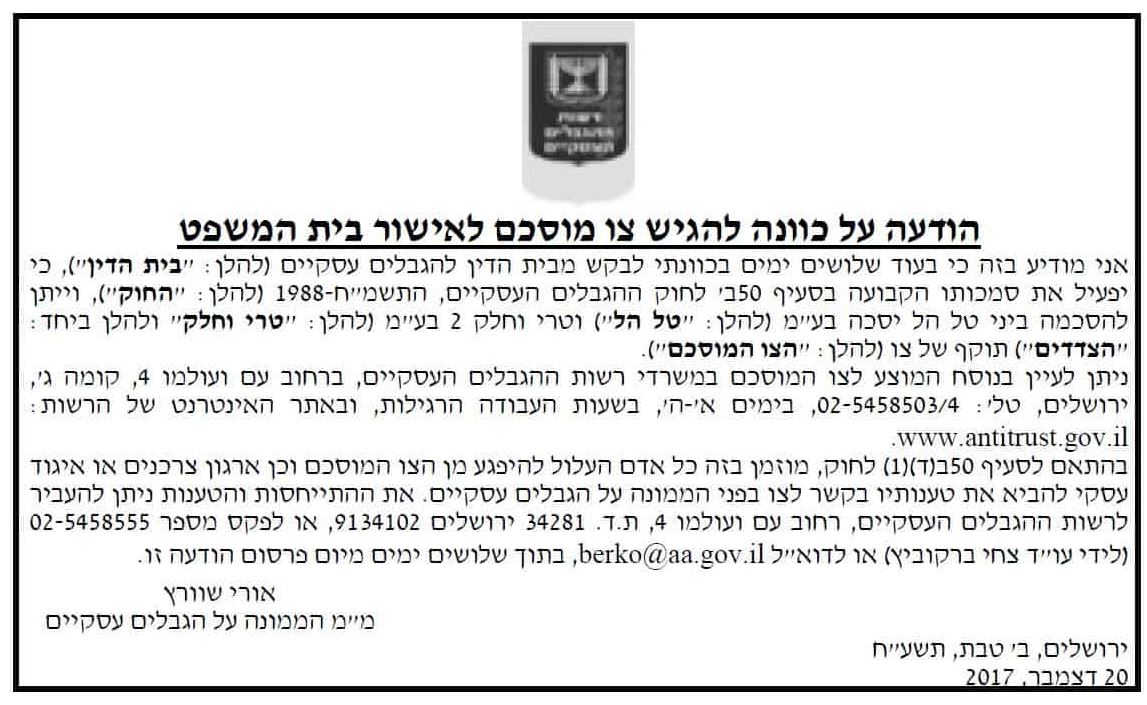 מודעה על כוונה להגשת צו מוסכם לאישור בית המשפט, מתפרסמת לרוב בעיתון יומי. במודעה הממונה על הגבלים עסקיים מודיע על כך שבכוונתו לבקש מבית הדין להגבלים עסקיים שיפעיל את סמכותו הקבועה בסעיף 50ב' לחוק ההגבלים העסקיים.